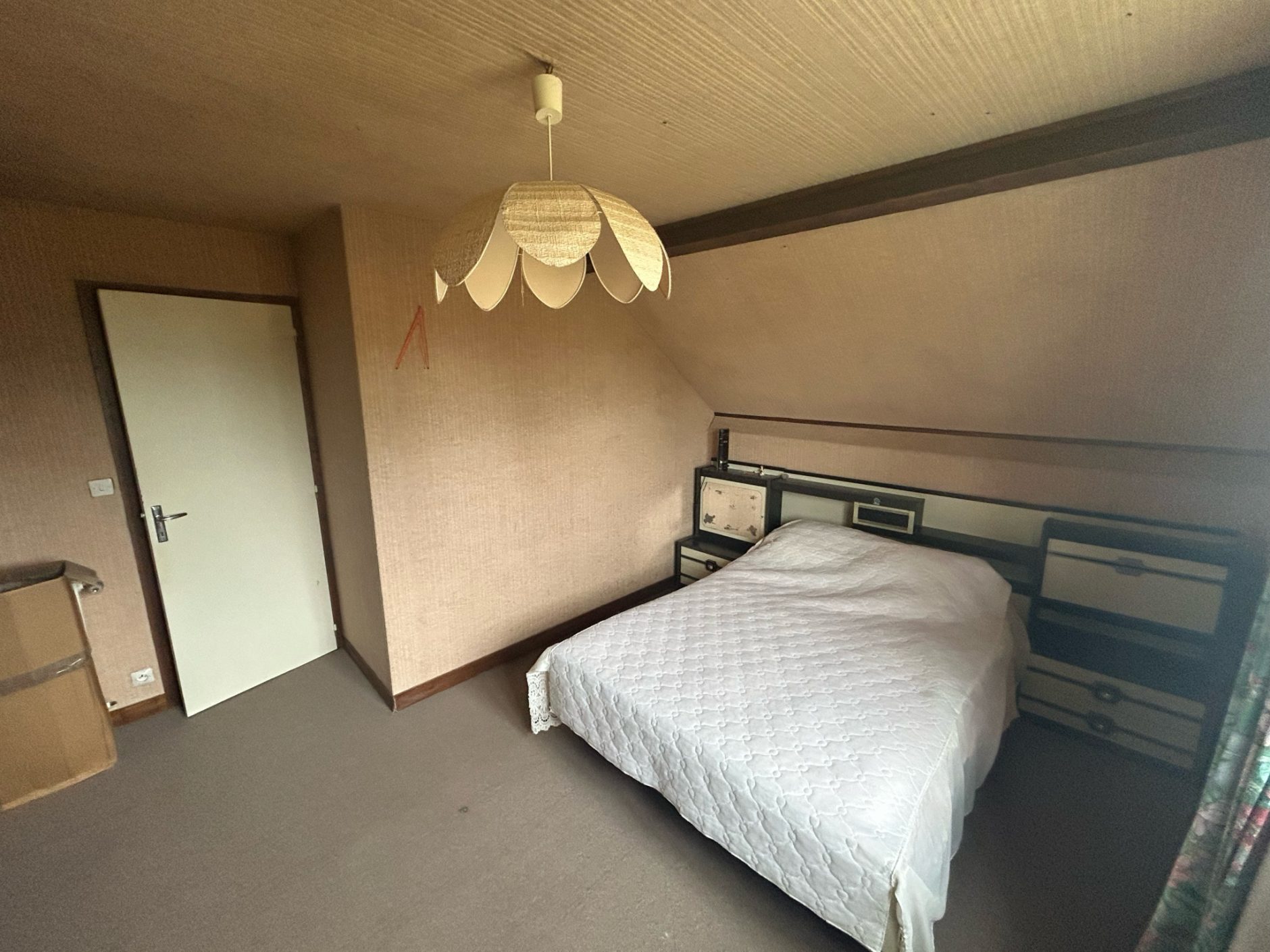 À l’étage, un couloir dessert deux chambres mansardées, une salle d’eau à rafraîchir, ainsi qu’un grenier partiellement aménageable où un dressing ou un espace bureau peuvent facilement prendre place.
