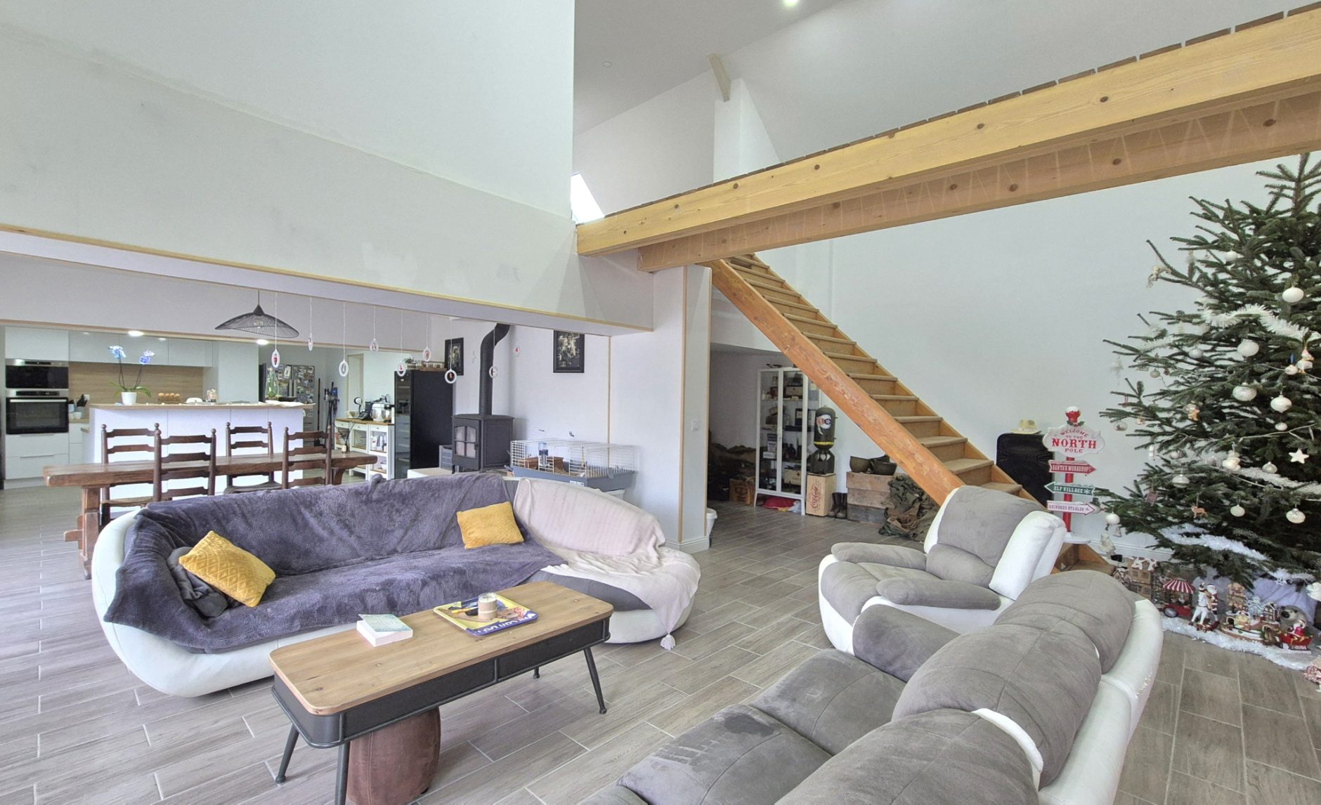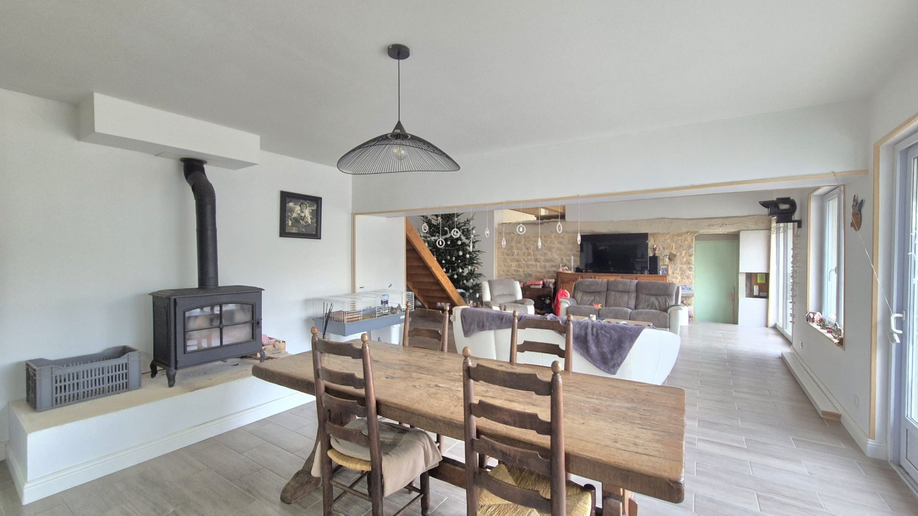 Au rez de chaussée : une entrée, une cuisine ouverte équipée (17.5 m2), un espace salon/séjour, salle à manger de 67.5m2, d'une buanderie, une salle d'eau avec WC, 2 chambres